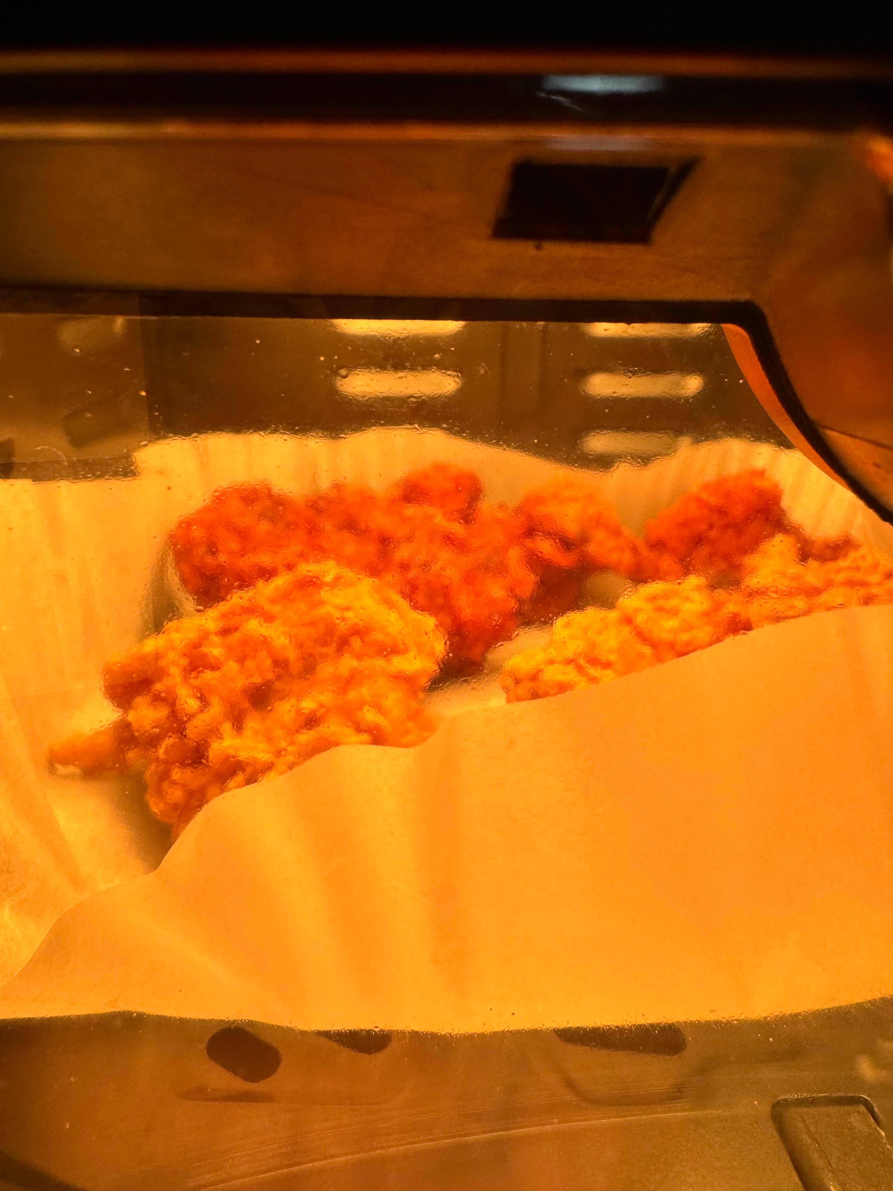 양념치킨을 겹치지 않게 종이호일 위에 올리고 180도로 5~7분 돌리면 됩니다.