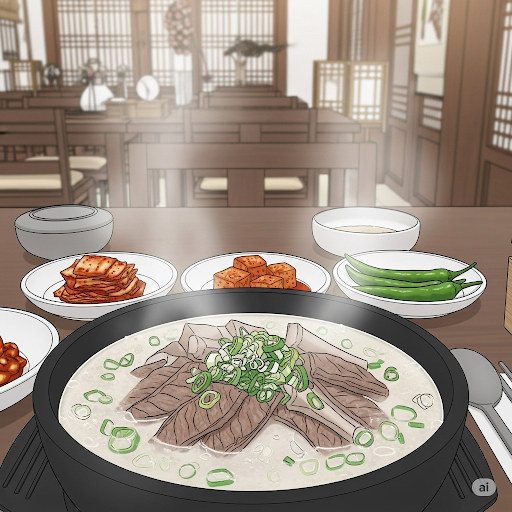 국밥은 사골육수에 밥과 고기를 넣어 푸짐함을 더한 음식으로, 케데몬에서 피로를 풀어주는 상징적인 메뉴입니다.