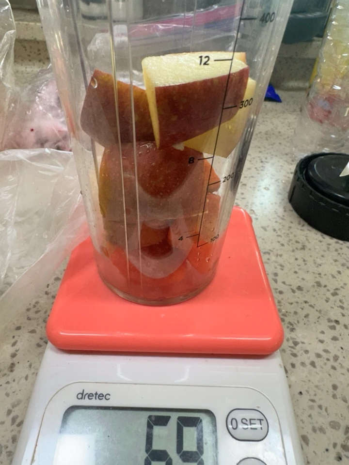 - 구체적인 양은 사과 1개(약 90g), 비트 1/3개(약 30g), 당근 1개(약 90g) 정도가 적당해요.